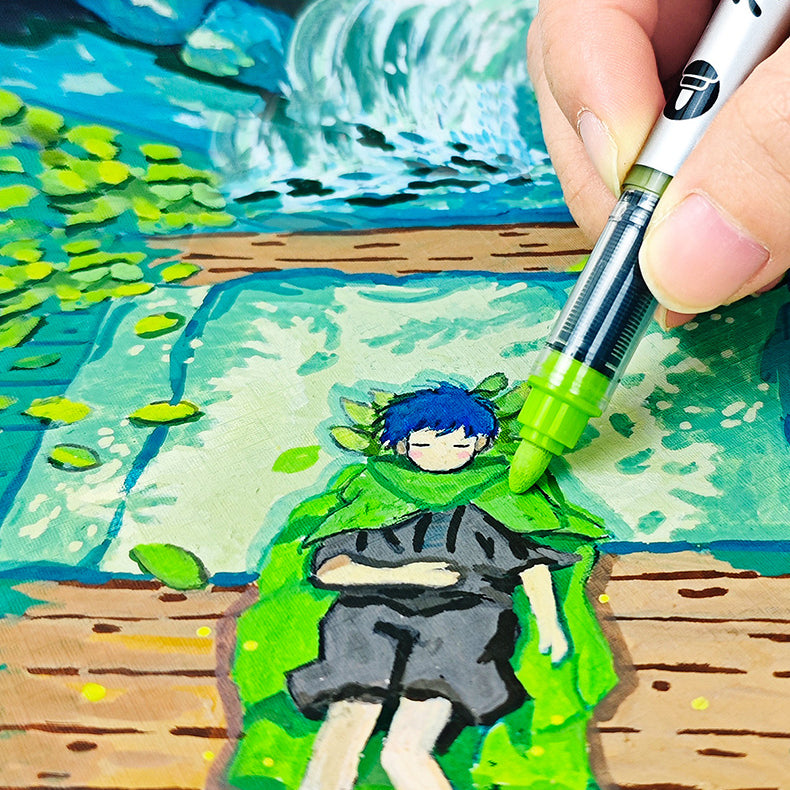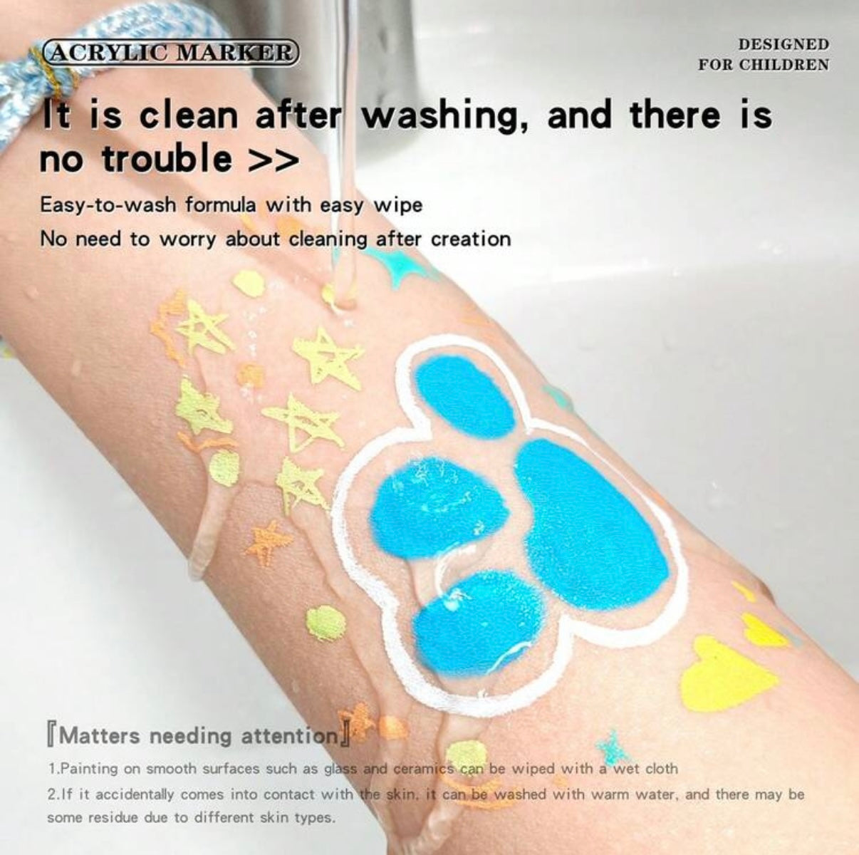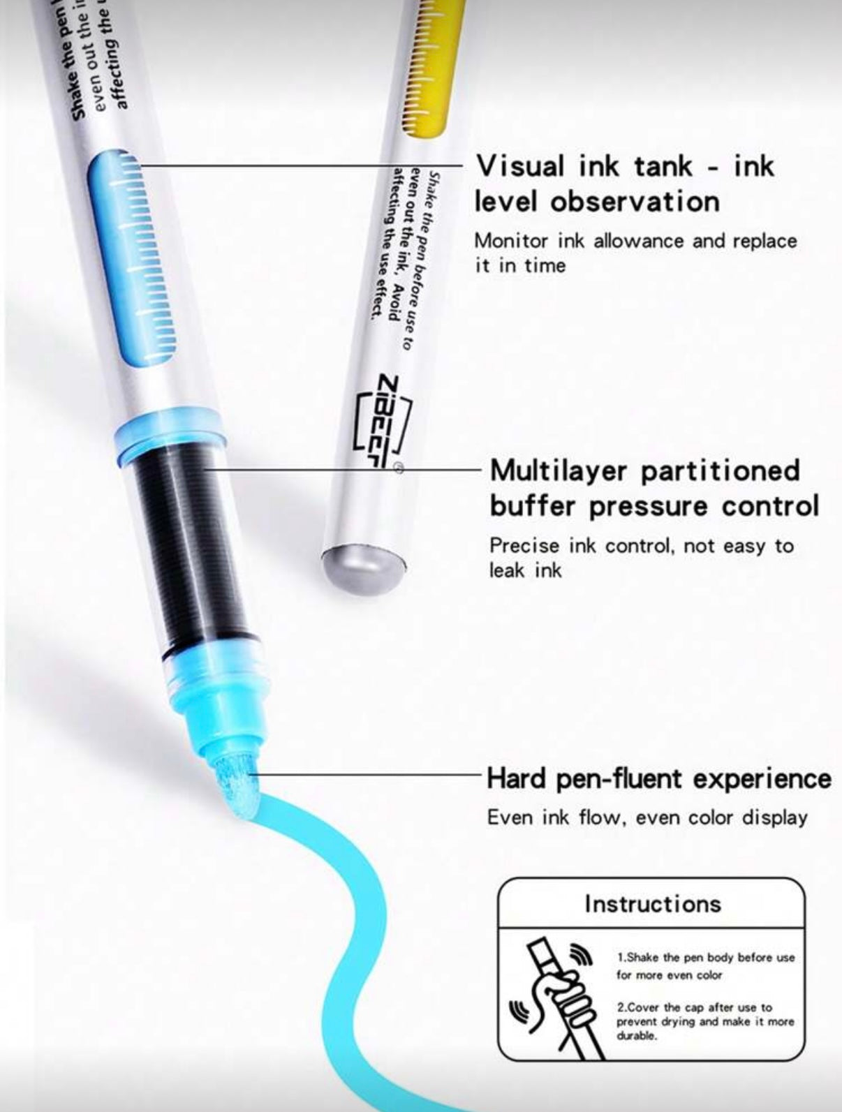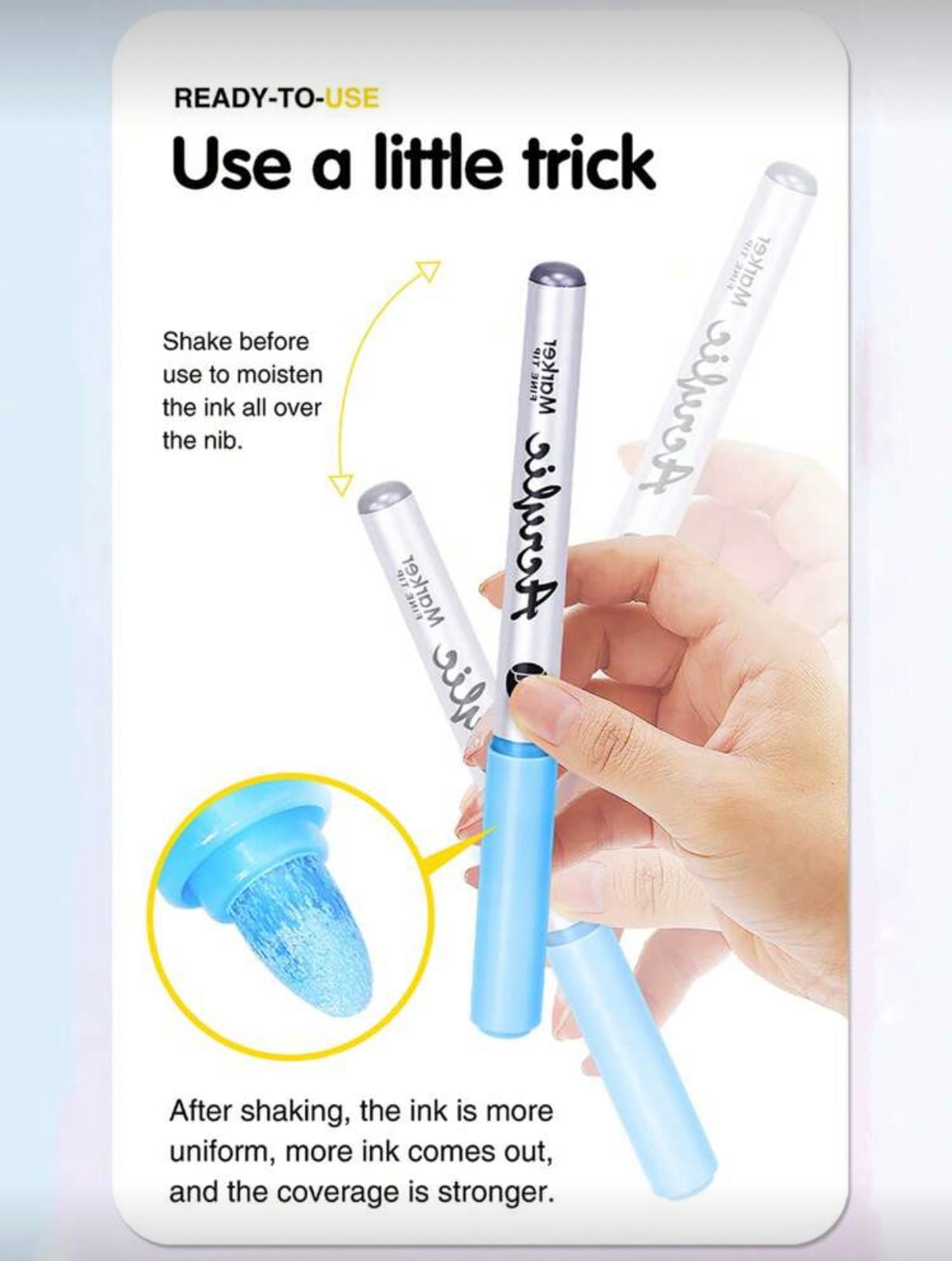Fixy mají tvrdý jemný hrot, vodou ředitelný akrylový inkoust a rovnoměrné krytí bez šmouh. Nepropíjejí papír, rychle schnou a dobře sedí v ruce – skvělé pro začátečníky i zkušené tvůrce.
